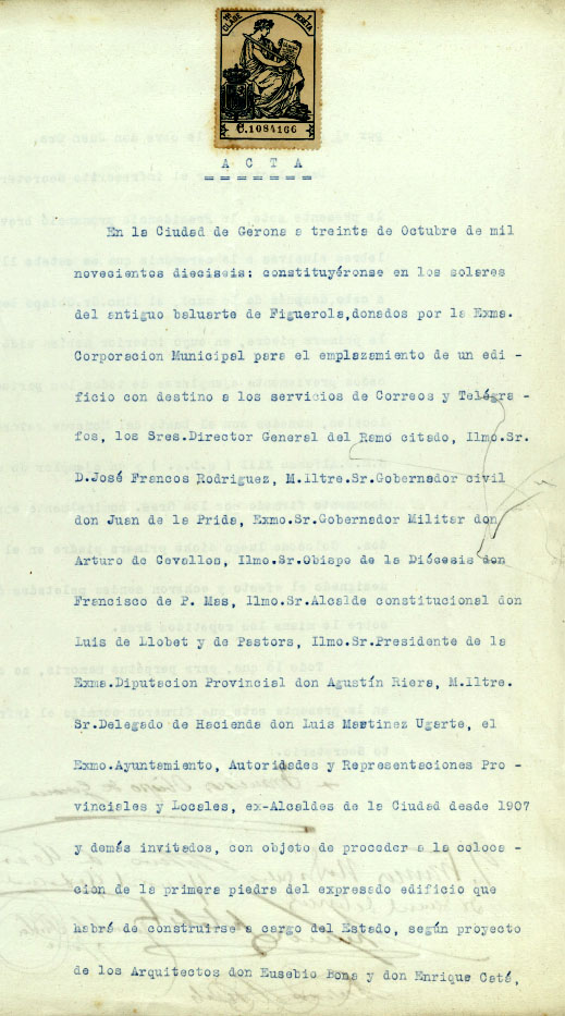 El 30 d'octubre de l'any 1916, dins la programació de Fires de Sant Narcís, se celebrà solemnement la col·locació de la primera pedra del nou edifici de Correus i Telègrafs de la ciutat.