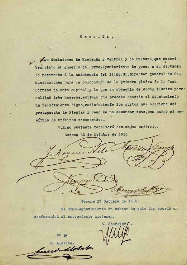 (Ampliar) - Comunicació de la comissions d'Hisenda i de Cultura per tal que es procedeixi a rebre amb dignitat al director general de Comunicacions, 23 d'octubre de 1916. AMGi. Fons Ajuntament de Girona.