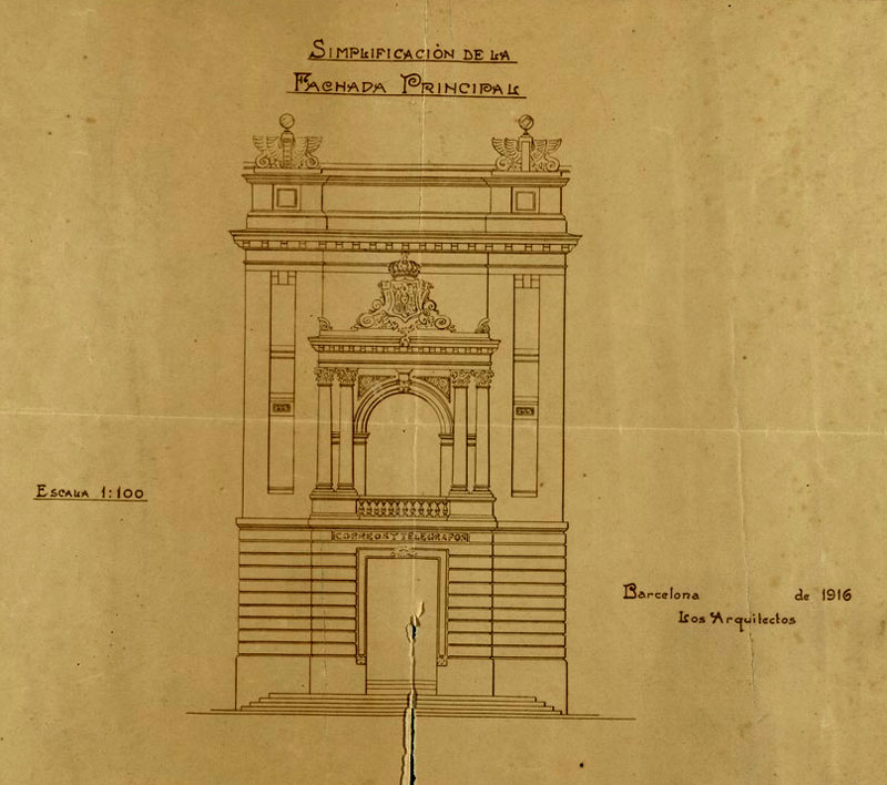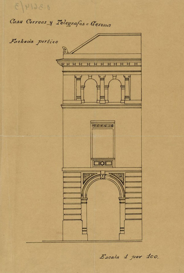 (Ampliar) - Plànol de la façana de la plaça de la Independència de l'edifici de Correus, 1916. Autoria atribuïda: Enric Catà i Eusebi Bona. AMGi. Fons Ajuntament de Girona.