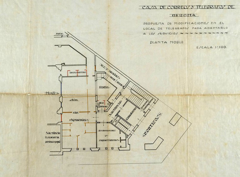 (Ampliar) - Plànol de les modificacions proposades per a l'edifici de Correus, 1916-1920. Autoria desconeguda. AMGi. Fons Ajuntament de Girona.
