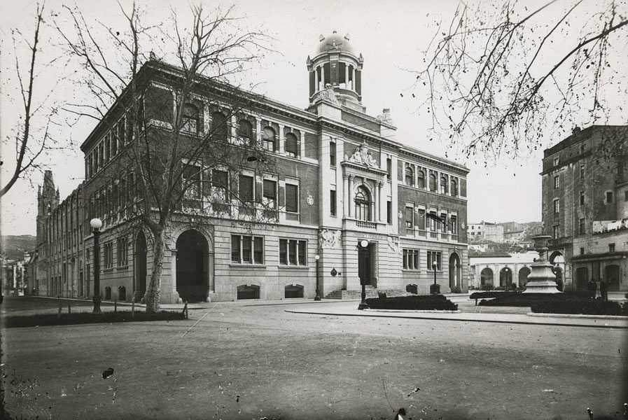(Ampliar) - Façana de l'edifici de Correus i Telègrafs, al final de la Gran Via de Jaume I. 1920 - 1924. Autor desconegut. CRDI - Ajuntament de Girona.