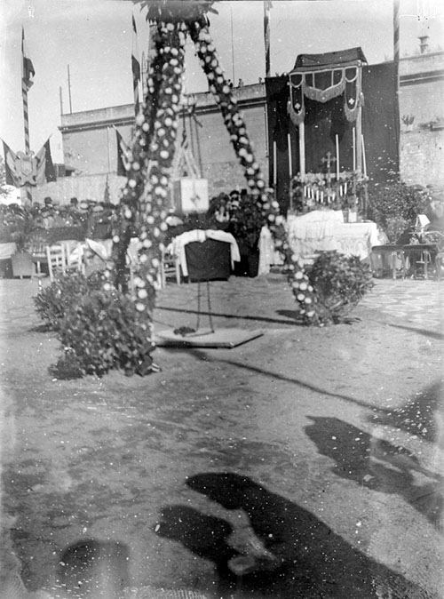 (Ampliar) - Estructura i altar instal·lats per a l'acte de col·locació de la primera pedra de l'edifici de Correus i Telègrafs de Girona, 30 d'octubre de 1916. Autor desconegut. CRDI - Ajuntament de Girona.