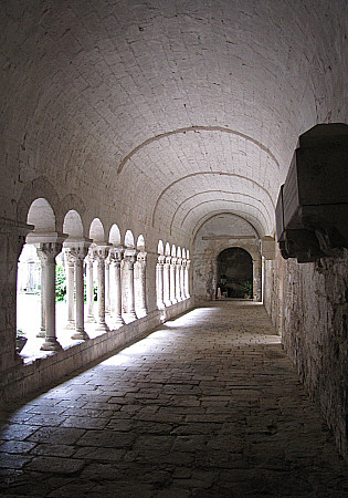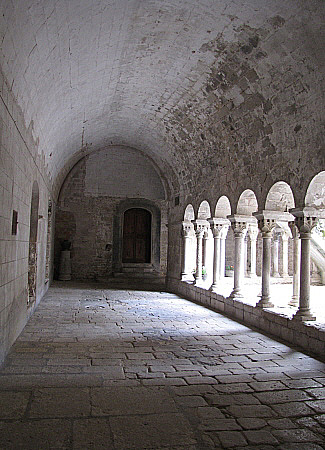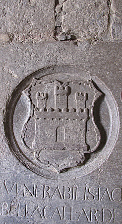 El claustre del monestir de Sant Daniel. Làpida funerària amb decoració heràldica.