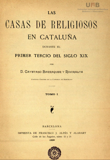 - "Las casas de religiosos en Cataluña durant el primer tercio del siglo XIX", D. Cayetano Barraquer y Roviralta, 1906. Barcelona, Impremta de F.J. Altés y Alabart.