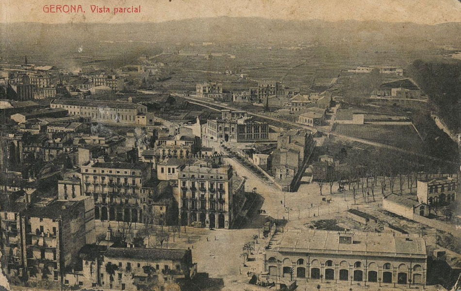 - Vista parcial del barri del Mercadal des d'un punt elevat. A l'esquerra la Gròber i el Baluard del Governador, al centre l'escola Bruguera i la Gran Via de Jaume I, a la dreta, l'avinguda de Ramon Folch, i en primer terme la plaça de Sant Agustí. 1914-1916. Autor desconegut. Col·lecció Ajuntament de Girona - CRDI.