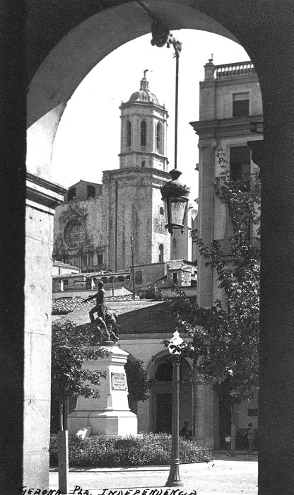 - Vista parcial de la plaça de la Independència des d'un dels arcs de la zona porxada. En primer terme, el monument als Defensors de Girona el 1808 i 1809. Al fons, la Catedral de Girona. 1939-1940. Autor desconegut. Ajuntament de Girona - CRDI