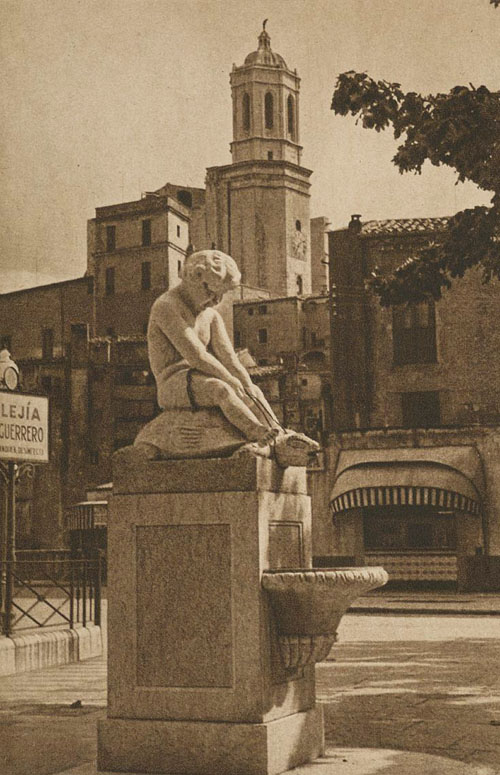 - La font de la Tortuga, a la plaça de la Independència. Al fons, la torre de l'Institut Vell i el campanar de la Catedral. 1945-1950. Autor desconegut. Ajuntament de Girona - CRDI