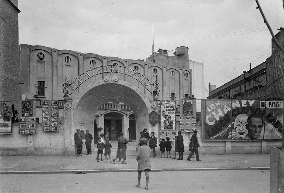 - El Teatre Albéniz, un dels cinemes que hi havia a la plaça, 1928. S'hi anuncia el film "Rie, payaso, rie", amb Lon Chaney. Foto Lux. Ajuntament de Girona - CRDI