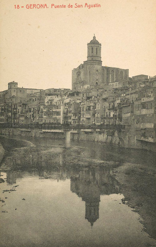 - El riu Onyar al seu pas pel centre de la ciutat, travessat pel pont de Sant Agustí. S'observen les cases de l'Onyar entre les quals destaca la Casa Masó pintada de blanc. Al fons a l'esquerra, l'Institut Vell i al centre, la Catedral. 1919-1925. Autor desconegut. Col·lecció Ajuntament de Girona - CRDI