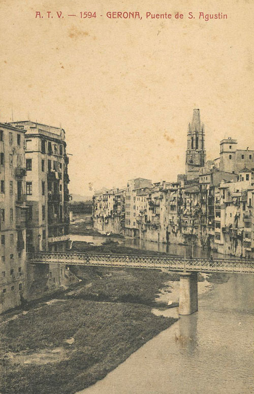 - Vista del riu Onyar al seu pas pel centre de la ciutat amb el pont de Sant Agustí i les cases de l'Onyar com a element central. Darrera seu sobresurten el campanar de l'església de Sant Feliu i la torre de l'Institut Vell. 1905-1911. Autor desconegut. Col·lecció Ajuntament de Girona - CRDI