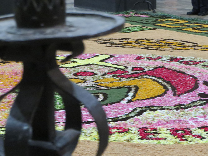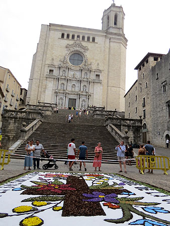 Al llarg de la jornada, desenes de voluntaris de la dotzena de confraries que conformen la Junta de Confraries van engalanar els carrers del Barri Vell amb les catifes amb decoracions florals, com a preludi de la missa solemne que es va dur a terme a la Catedral, oficiada pel bisbe fra Octavi Vilà i Mayo, acabada la qual l'Àliga va fer el ball d'honor, i seguidament s'inicià la processó, que va desfilar fins a la Basílica de Sant Feliu.
