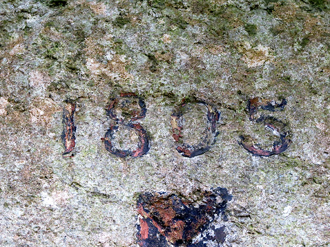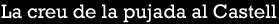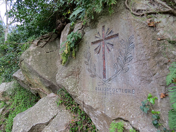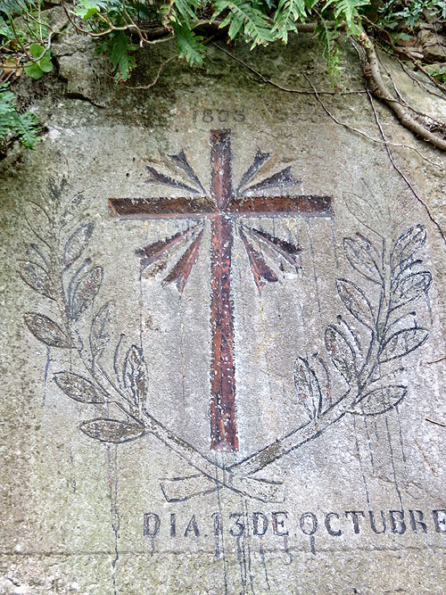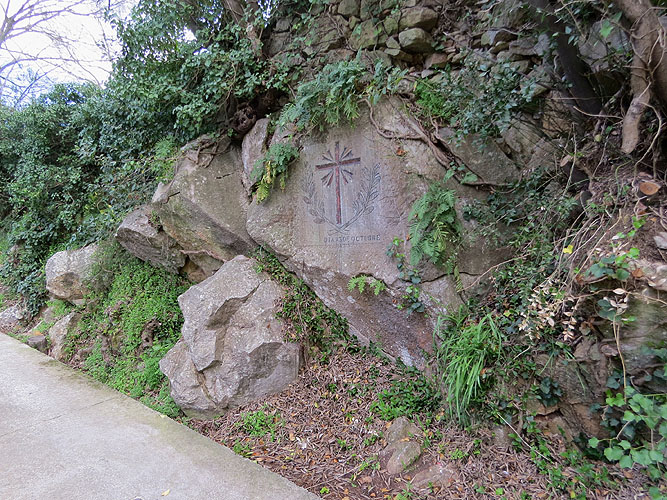 Al carrer de la Pujada al Castell, parel·lel als Jardins de John Lennon, al marge dret pujant a Montjuïc, apareix una talla en rebaix a la roca viva que sorpèn al passejant. Damunt una àrea allisada, s'hi observa una creu nimbada d'una corona de llor i al seu voltant una inscripció, a la part superior: "1805", i una altra a la part inferior: "DIA 13 DE OCTUBRE". Sense cap nom, només una data.