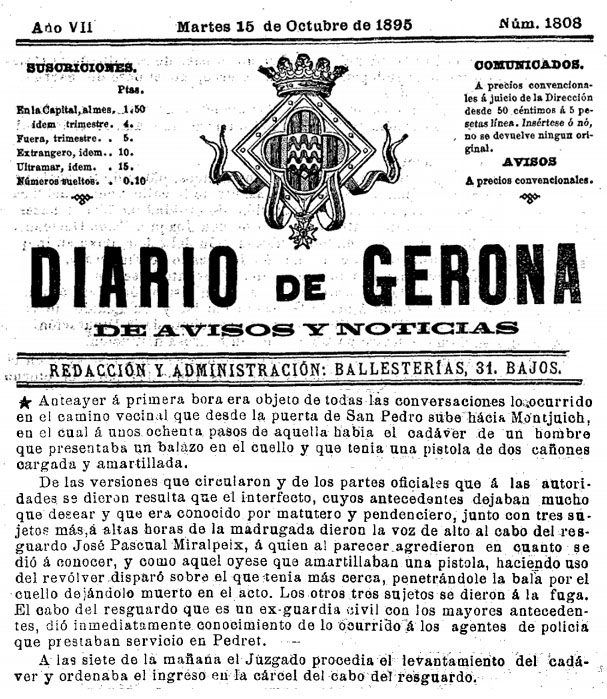 (Ampliar) - Notícia publicada al 'Diari de Gerona' del 15 d'octubre de 1895 Fa de mal suposar que si el mort era conegut per "matutero y pendenciero", se li retés un homenatge tan consistent. No obstant, la coincidència de l'indret, el dia i el mes (i fins i tot l'any, si atenem l'error en una xifra, error que no es detecta en la talla), podriem donar per bona aquesta explicació. Sobretot, a manca de qualsevol altra que presenti tantes coincidències.