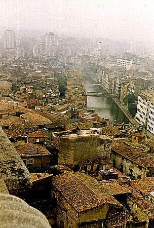 Foto esquerra.En primer terme, el Barri Vell. Més enllà, els arbres de la Rambla de la Llibertat al costa del riu Onyar, sobre el que es retalla el pont de les Peixateries Velles, i més enllà el Pont de Pedra.