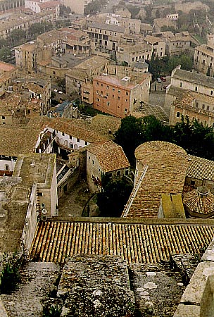 Foto dreta.En primer terme, la teulada dels claustres de la Catedral, i més enllà, la teulada rodona que corona la Torre Cornèlia, a l'inici del Passeig Arqueològic, i a la seva esquerra l'edifici de les Sarraïnes. Darrera els arbres s'aprecia, a la dreta el monestir de Sant Pere de Galligants, i a la seva esquerra, la cúpula octogonal de Sant Nicolau. |
