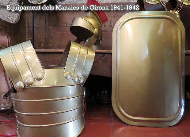 El 1940, després de la Guerra Civil, els Manaies de Girona tornen a participar en la processó de Setmana Santa. Els primers equipaments es varen llogar en un magatzem de teatre de Barcelona. Però per a la processó de 1941 s'elaboraren ja uns equipaments nous, de moment de llauna pintada, que volgueren inspirar-se en els relleus de la Columna Trajana de Roma, però conservant l'esperit estètic tradicional del Manaia gironí.