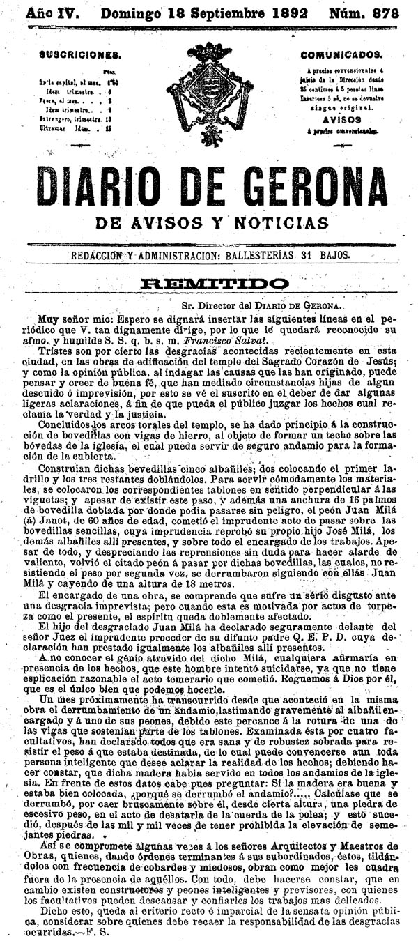"Diario de Gerona de avisos i notícias" Diumenge 18 de setembre 1892.