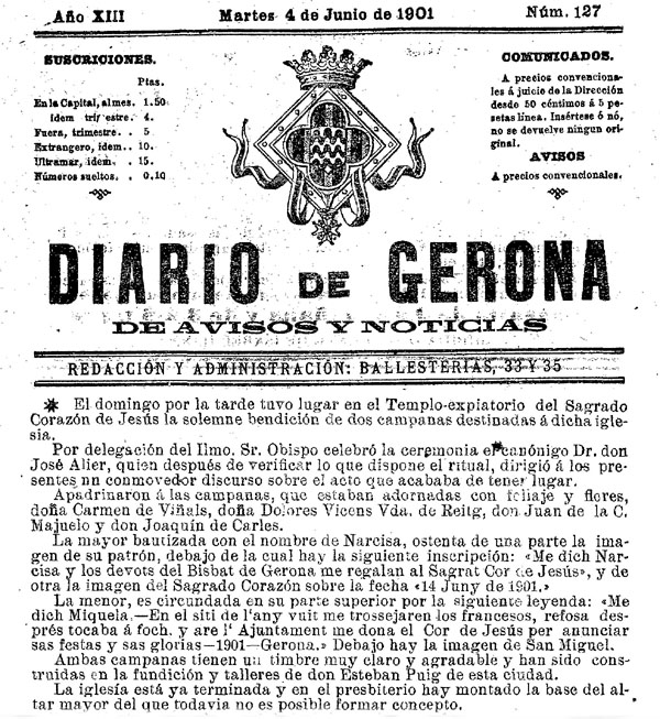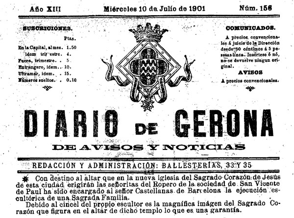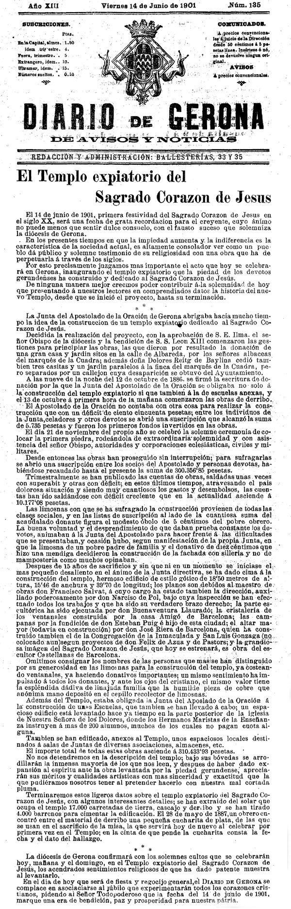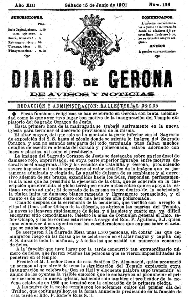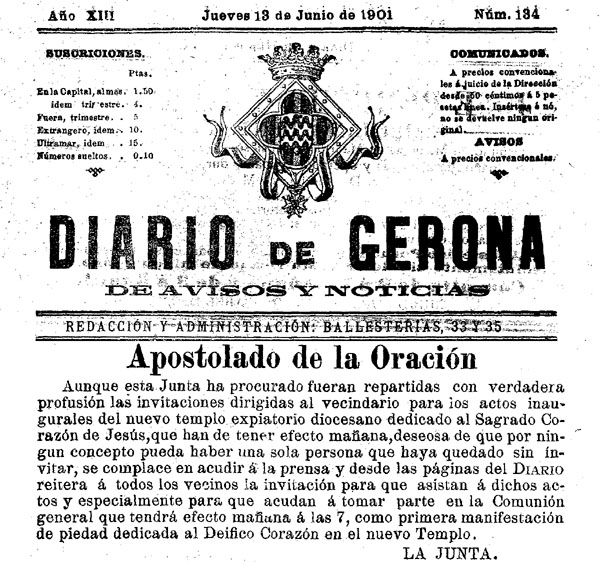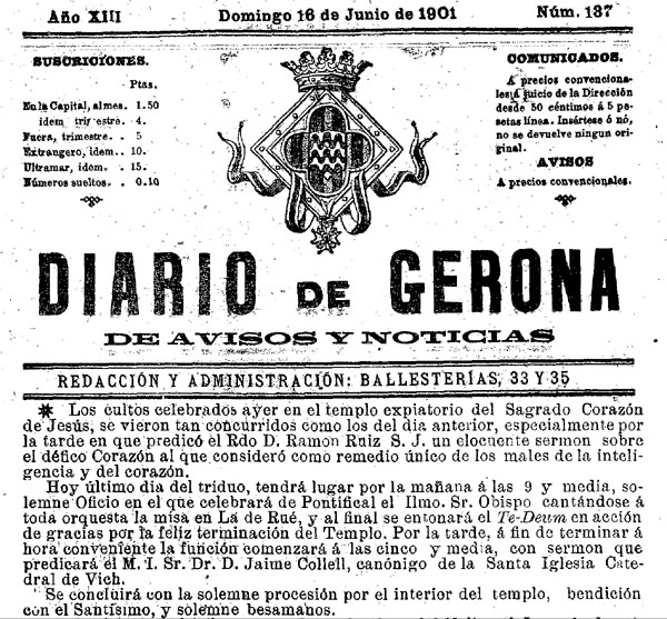 El 14 de junio de 1901, primera festividad del Sagrado Corazón de Jesús en el siglo XX, será una fecha de grata recordación para el creyente, cuyo ánimo no puede menos que sentir dulce consuelo, con el fausto suceso que solemniza la diócesis de Gerona.
