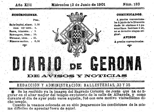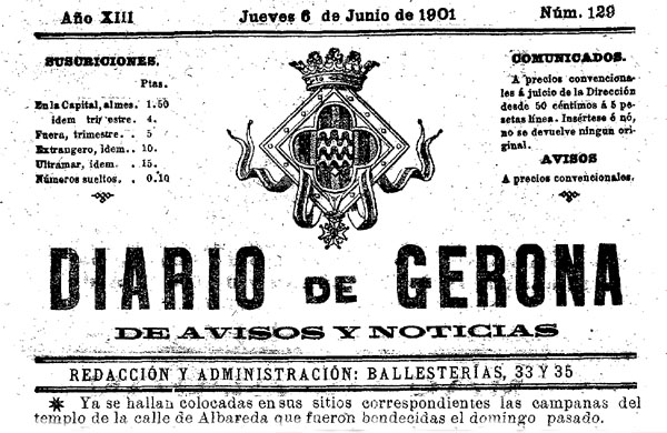 "Diario de Gerona de avisos i notícias" Dijous 13 de juny 1901.