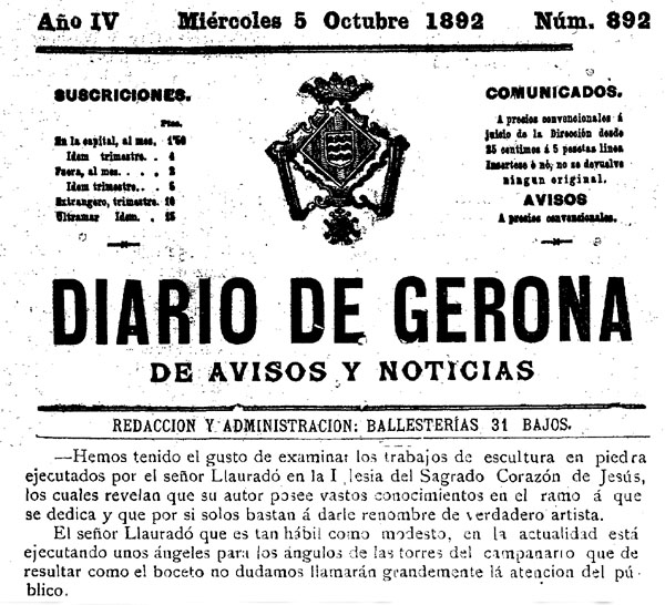 "Diario de Gerona de avisos i notícias" Dimecres 5 d'octubre 1892.