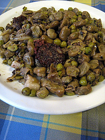 Les faves ofegades, o a la catalana.L'escriptor Manuel Vázquez Montalbán considerava que aquest plat era un dels pilars gastronòmics de la nació. Aquest plat ja està documentat a l'Edat Mitjana, quan les estacions agrícoles forçaven i governaven la variació alimentària de la població; així, es conserven receptes dels segles XIV i XV com "ffaves tendes ab let de amelles" o bé com "ffava ffressa blancha". Els mestres de cuina de principis del segle XX condimentaren més els plats preparats amb faves, donant lloc a l'actual preparació. Miralpeix i Riera, al treball referenciat a la bibliografia, consideren que les faves a la catalana podria haver derivat d'una recepta del segle XVIII en què s'explica com es fan les faves: "Cou cancelada, y fossa sia tiri las fabas netas ab sal posa-las al foch violentat, tapa-las be dexa-las courer mitja hora tomba-las 4, ó 5 vegades, tiri pebre y menta trinxada, luego las rullas de cancelada, botifarra y carxofas fregidas antes". ![]() Els ingredients.Amb moltes variants en allò que es refereix als components del plat, habitualment s'hi sol posar faves desgranades, cansalada viada tallada a daus, botifarra negra, cebes tendres trinxades, alls tendres trinxats, menta fresca, una cabeça d'alls, oli, sal, pebre i aigua. Opcionalment, s'hi afegeix llorer i costelló de porc i una variant molt freqüent consisteix en afegir-hi pèsols. ![]() La preparació.En una olla es rosseja la cansalada, els alls i la ceba. Un cop sofregits s'hi afegeixen les faves, les herbes i la botifarra negra, una tassa d’aigua, es i salpebre. Es tapa i es deixa a foc fluix fins que les faves estiguin cuites. Variacions: es pot fer amb pèsols a més de faves (pèsols i faves ofegats) i també s’hi pot posar marduix a més de la menta. Al final de la cocció s’hi pot tirar un raig d’anís o mitja copeta de barreja (moscatell i aiguardent). |