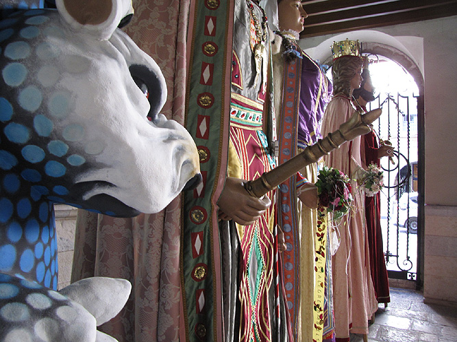 Síntesi: Durant els dies de les Fires de Sant Narcís de Girona 2012, i a l'espera de sortir a la Trobada de gegants del diumenge 4 de novembre, els gegants i les figures del bestiari de la ciutat han estat exposats a l'entrada de l'ajuntament. Aquí els han pogut visitar i fotografiar-s'hi mainades i grans, podent gaudir-los de ben a prop, immòbils, com no ho poden fer durant les cercaviles i ballades que protagonitzen. També és una ocasió única de veure l'Àguila de la ciutat.
