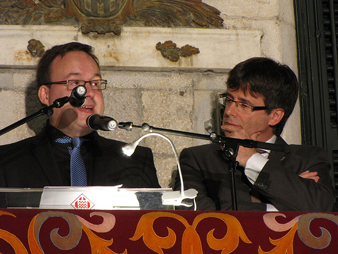 Després de la cercavila i l'espectacle de gegants i capgrossos, va tenir lloc el pregó enguany a càrrec de Francesc Cassú, director de la Principal de la Bisbal. 33 fotografies. [Article] |