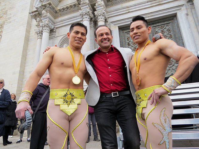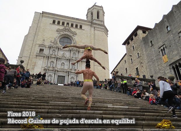 El dilluns 29 d'octubre 2018, diada de Sant Narcís, els peruans Duo Vitalys (Pablo Nonato i Joel Yaicate) van batre el rècord Guinness de pujar esglaons cap en cap, una modalitat en equilibri en què el portor sosté amb el cap el seu company en posició invertida mentre puja escales. Van pujar 99 esglaons en 53 segons, superant la marca de fa dos anys d'una parella vietnamita, els Giang Brothers, que va pujar els 90 de l'escala de la Catedral. El rècord consistia en pujar el màxim de graons en menys d'un minut; per aconseguir superar la marca anterior, es varen instal·lar davant l'entrada de la Catedral nou graons més.