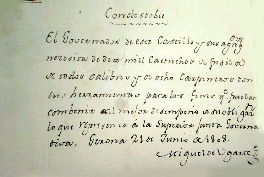 A Francisco de Zamora (1757-1812), qui visità Girona el 1790, el fort li va semblar inútil i en situació pitjor atès que "su mala situación, la del terreno y la de la ciudad, ha hecho que necesite para su defensa cinco accesorios que todavía no impiden que esté dominado y que no puede impedir que se tome la ciudad [por] ser muy bajo y hallarse abandonado". Pensa també que és tanta la seva "inutilidad y la poca necesidad de gobernador, que podría llamarse labrador [por] lo bien cultivado y sembrado que lo tiene". Aquesta nota crítica de Zamora fa pensar en un cert relaxament de les autoritats militars gironines. Concretament els governadors dels baluards de Girona semblaven haver reconvertit els espais militars en agrícoles, anticipant les mesures desamortitzadores, denotant però poca sensibilitat per als esdeveniments del país veí. (Montserrat Molí Frigola, "Arquitectura i urbanisme a Girona durant el segle XVIII. Les propostes il·lustrades de Francisco de Zamora"). ![]() (Ampliar) - 'El Condestable solicita cartuchos'. 21 de juny de 1808. Fons Junta Governativa de Girona. Junta Militar 1808, lligall 2, junta militar 4. Gentilesa de Sergi Moreno. Bibliografia.