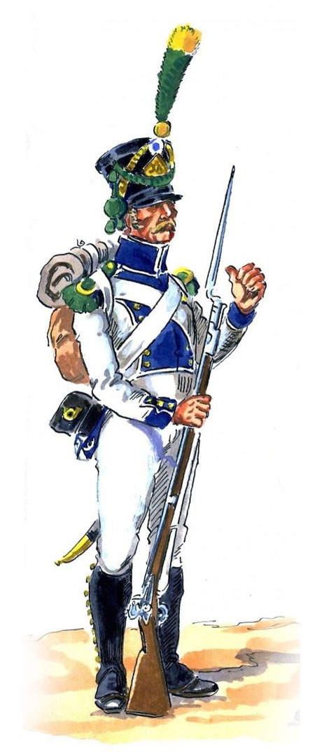 (Ampliar) - Voltigeur del 2n Regiment d'Infanteria de Línia de Westfàlia. Setge de Girona. 1809. Dibuix de M. Boisselier. Viquipèdia.