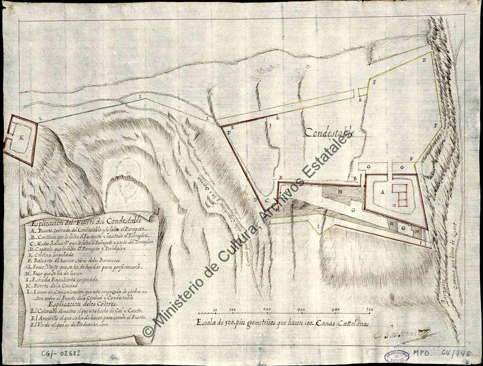 ![]() El fort. Construït de forma precària el 1653 i reformat el 1675, tenia forma de trapezi amb petits baluards en tres dels seus quatre angles. Disposava de camins coberts per comunicar-se amb el fort de la Reina Anna i el reducte de la Ciutat. Va rebre aquest nom en atenció al conestable de Castella Iñigo Melchor (o Melair) de Velasco que, mentre va defensar Girona durant el setge de 1653, va acampar en aquest lloc amb les seves forces de cavalleria. Era la força més gran de la muntanya i la seva principal funció era cobrir el costa est de la ciutat. ![]() (Ampliar) - Detall de 'Plan du Siège de Gironne par l'Armée de sa Majesté en Catalogne en 1809'. 1809. Bibliothèque nationale de France. S'hi observen, d'esquerra a dreta: Fort del Conestable (D), Fort de la Reina Anna (E) i Fort dels Caputxins (F), amb els camins coberts que els unien. Al volum 8 de "Diccionario geográfico-estadístico-histórico de España y sus posesiones de ultramar", de Pascual Madoz (Madrid, 1847) és descrit com "de figura irregular, asemejándose a un cuadrilongo, cuyo lado mayor de E. a O. será de poco mas de 200 varas y el menor de N. a S. de 100. Por la parte que mira al S., y por donde se comunica con los otros dos fuertes de la Reina Ana y Capuchinos, hay un pequeño fuerte con 2 medios baluartes en sus estremos. De este dependen otras dos pequeñas obras destacadas hácia la plaza y Monjuich, que ocupan igual número de puntos planos y elevados, avanzadas al N. del Condestable; la mas al E., es el fuerte del Calvario, que forma la figura de una estrella irregular, cuyo mayor diámetro es de 75 varas y 37 el menor; el otro reducto mas reducido se llama del Cabildo; es casi de figura de rombo, y corresponde con bastante dominacion y proximidad á las torres de la Gironella y del Peix". ![]() (Ampliar) - Plano del Fuerte del Condestable. 1685. Archivo General de Simancas. Gentilesa de Sergi Moreno. L'entrada de Noailles a Girona. Durant la Guerra dels Nou Anys, un document signat a Madrid amb data de 8 de juliol de 1694, narra que "El dia 12 de junio el Duque de Noailles empezó a circuir con su ejército la ciutat de Gerona [...] y el dia 22 puso batería en la montaña y batió por algunas horas el convento de los Capuchinos [...] y luego se puso a trabajar dichos ataques para las baterias contra el fuerte del Condestable y lo demás de la plaza [...] y empezó a batir dicho fuerte hasta el día 25, y abiendo brecha el día 27 en dicho fuerte, lo desampararon los nuestros y lo mismo hicieron los de los fuertes del Cabildo y Ciudad, retirándose a la plaza. Continuó el enemigo haciéndose dueño de dichos fuertes, a batir la ciudad". ("Documentos inéditos referentes a las postrimerías de la Casa de Austria en España, Volum 1. Adalberto (Prince of Bavaria), Gabriel Maura Gamazo. 2004. Centro de Estudios Políticos y Constitucionales. ISBN 84-2591-275-7). ![]() (Ampliar) - Detall de 'Plan de la ville de Gironne ses forts et redouttes, attaques et tranchées'. 1694. Bibliothèque nationale de France. Amb el número 4 s'hi indica el fort del Condestable. L'incendi de 1718.