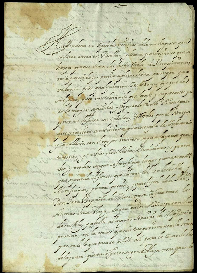 (Ampliar) - 20 de juny de 1673. El lloctinent Francisco Fernández de Córdova-Cardona, duc de Sessa i de Baena, als jurats de la ciutat de Girona. Assabentat del gran nombre de gent que està entrant al Rosselló, els comunica que ha decidit reforçar la defensa de la ciutat enviant-hi més tropes d’infanteria i cavalleria i fortificant el castell de Montjuïc i el fort del Conestable. Lletres Reials, Ajuntament de Girona.