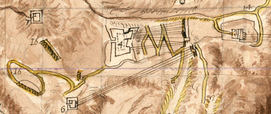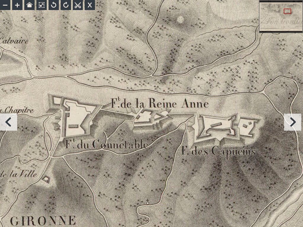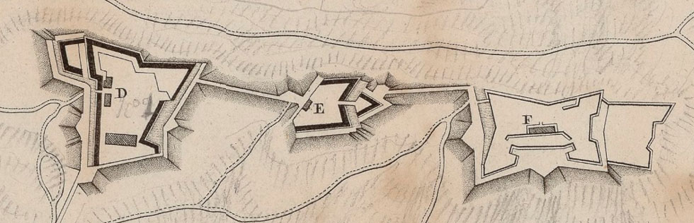 Quan eren les 9 de la nit del mateix dia, un dissabte, es va oferir a pujar dalt les Pedreres a reconèixer l'estat de l'incendi un paleta de Girona anomenat Joan Oliveras. Així ho va fer i al cap d'una estona, ja de retorn, es va presentar a les autoritats recomanant que s'intentés de treure els barrils de pólvora per un petit pas (el foc encara no hi havia arribat) i que alhora es provés d'apagar el foc que encara continuava cremant material divers en el mateix sector on s'havia inicial al migdia. ![]() (Ampliar) - Detall de 'Plan de l'enceinte fortifiée de Gironne'. 1710. Bibliothèque nationale de France. S'hi observen, d'esquerra a dreta, els tres forts: el del Conestable, de la Reina Anna i dels Caputxins. La Guerra de Successió.