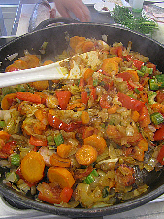 Suquet lleuger de fonoll i nècora amb llobarro al forn