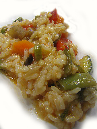 Posar l'oli i la sal (perquè no esquitxi) en una cassola, i sofregir-hi la verdura. Afegir-hi l'all picat, el pebre vermell i el tomàquet, sofregir una mica, i afegir l'arròs, el colorant i el brou de pollastre.