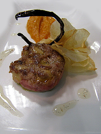 Acabar el plat amb dues hamburgueses, dos talls de poma i una escalopina de foie gras.