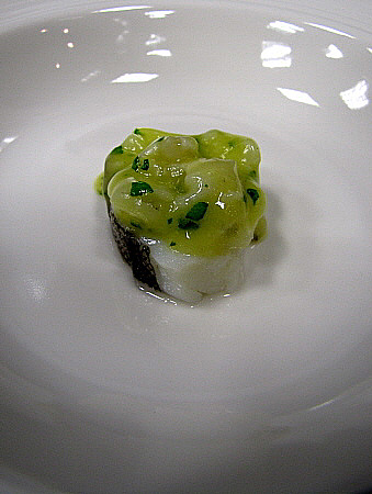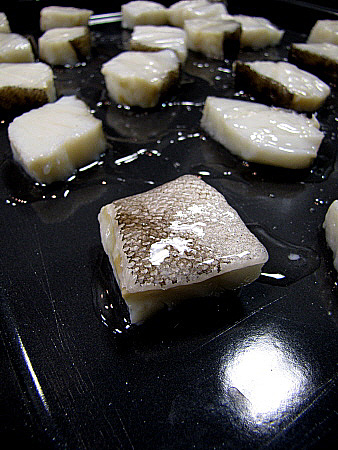Bacallà confitat amb pil pil lleuger de les seves cocotxes, tripa de bacallà i oli de pebre vermell picat