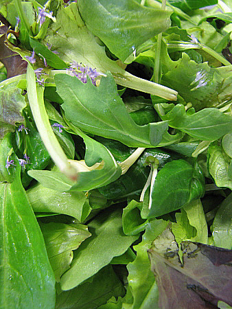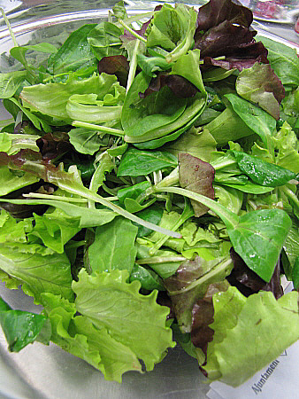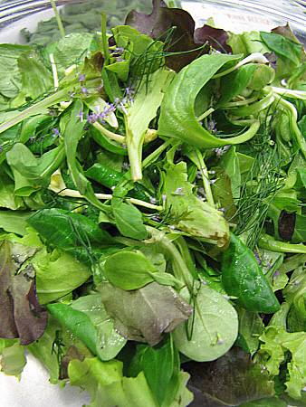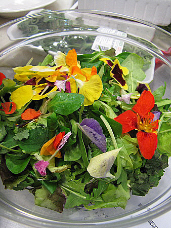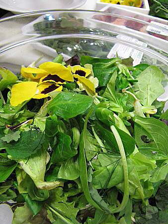 Amanida de pera, mesclum de flors i encenalls de foie amb aire de saüc