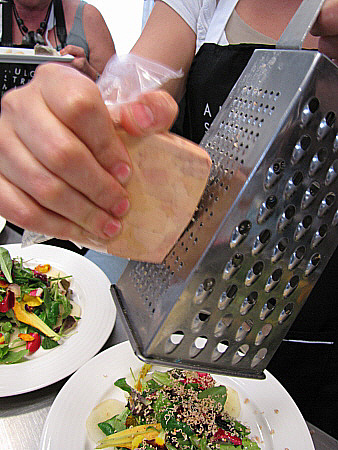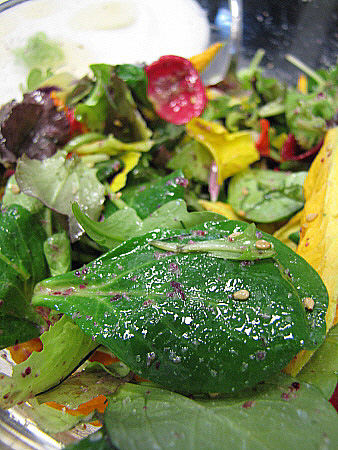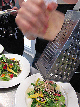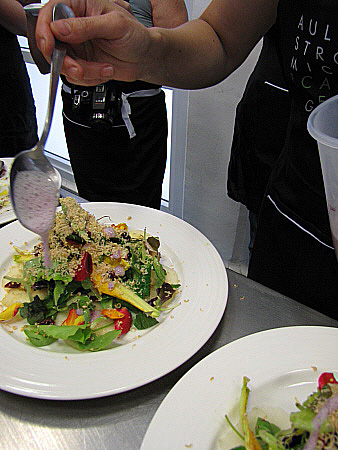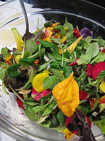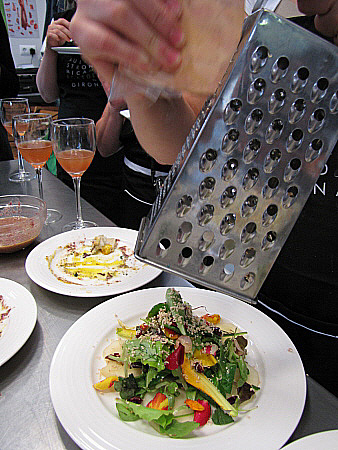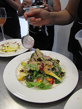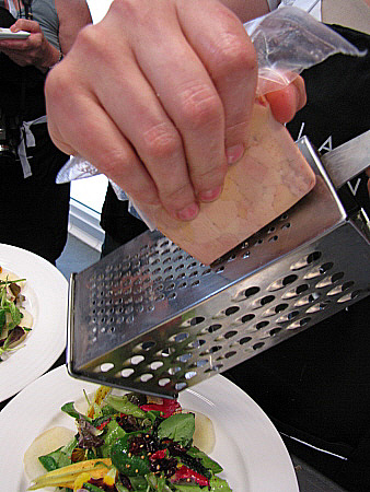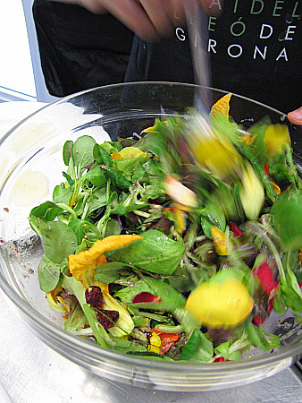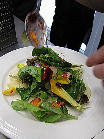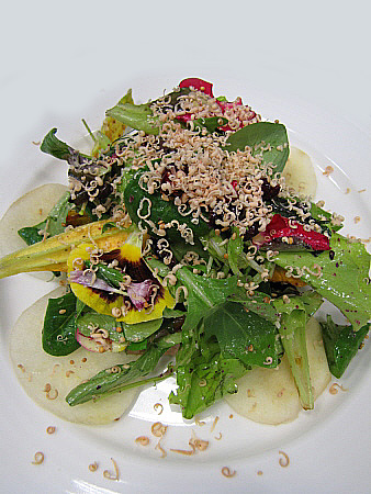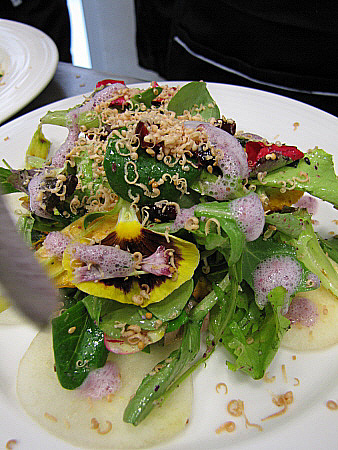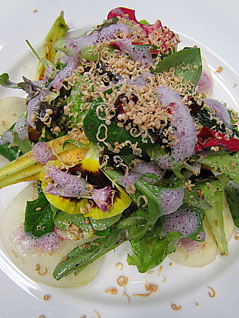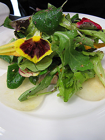 Amanida de pera, mesclum de flors i encenalls de foie amb aire de saüc