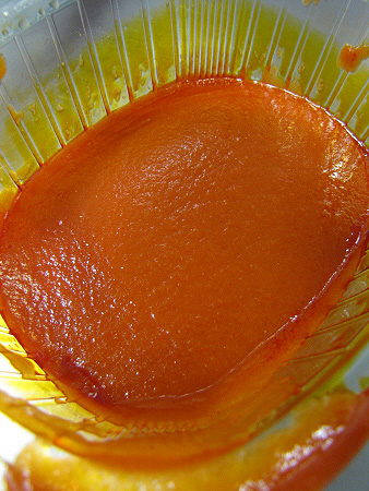 Muntatge del plat: posar el cistellet de pasta brick en un costat del plat, i omplir-lo amb la samfaina dolça que hem preparat. Fregir un tall de bacallà, prèviament dessalat, i col·locar-lo al costat del cistell amb una sanefa de caramel a sobre.