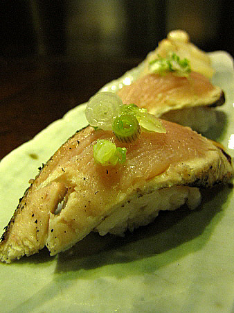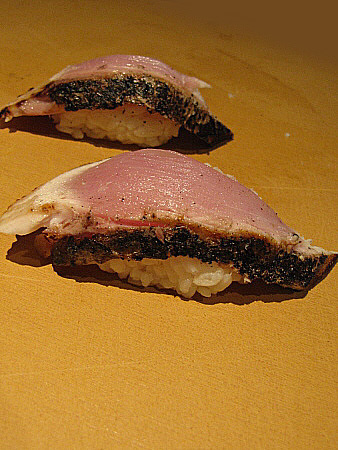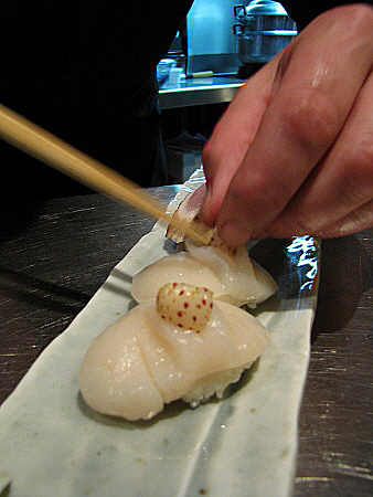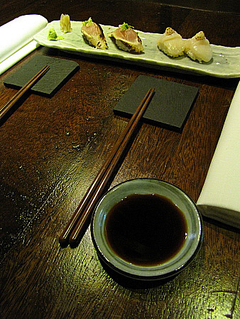 | Sushi nigiri de vieira amb maduixa albina, d'anguila caramelitzada amb hibiscus, i de salmó salvatge amb borraina.[Pujar] | ||||||||||