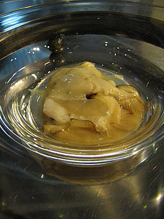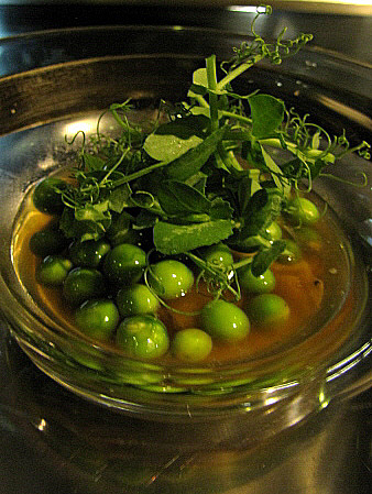 | Ostra oculta en brots i pèsols, amb infusió floral.[Pujar] | ||||||||||