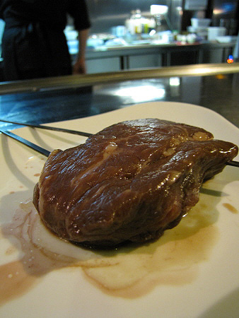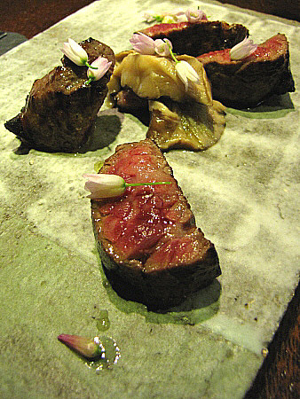 | Tall de vaca a la flama a l'aroma d'all silvestre.[Pujar] | ||||||||||