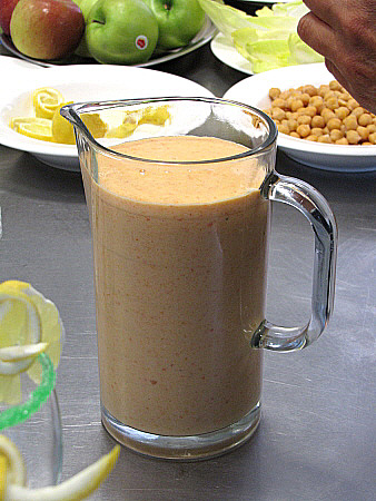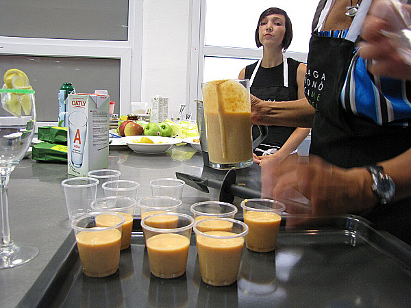 Posem els albercocs, el gel i l'estèvia a la batedora. Hi afegim la llet, els iogurts i ho batem.