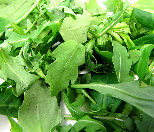 Es neteja bé la rúcula, es pela la fruita i es talla a quadrets.