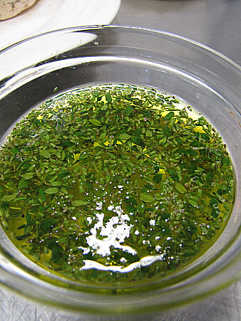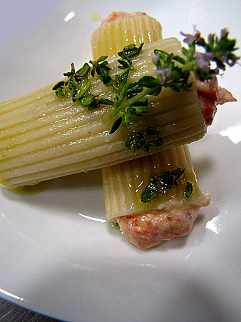Serviu la pasta a temperatura ambient amanida amb un bon raig d'oli amb flors de farigola.