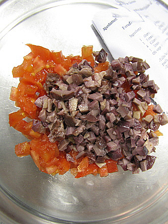Talleu les olives a dauets. Peleu i esmicoleu el formatge. Barregeu els tomàquets, el formatge i les olives, i farciu els macarrons.