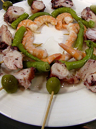 Fer la broqueta enfilant en primer lloc la oliva, després la rodella de pop, el tall de bitxo, i acabar amb la gamba.