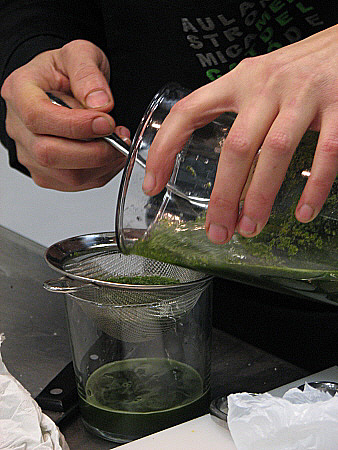 Liqüem les fulles i la tija de la borratja. Fem el suc de llimona i ho posem en una cocktelera juntament amb la ginebra i el gel.