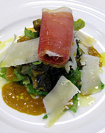 Netejar els enciams, tallar el pernil i fer encenalls amb el parmesà, i reservar-ho tot.